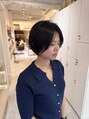 顎ラインでぱつっとカットしたミニボブスタイル。アイロンを通してオイルをつければ、ぱらぱらっと束感がでてお洒落です。カラーは赤みのない柔らかいオリーブベージュ。ブリーチ必須です。
