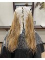 リタッチ長めで、すでにブリーチのかかっている部分にブリーチ剤が付かないようにペーパーブリーチしています。また、頭皮のダメージを考えて、根元ギリギリから塗布しています。