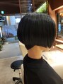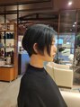 モード感を重視し、御客様のご希望の「ライン感」を大切にしました。特に襟足の処理により前下がりのラインに相対する対照的なV字ラインに仕上げました。