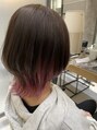 サイドは顎ライン、襟足は肩につくくらいのショートウルフにカットしています。インナーはブリーチ二回行い淡いピンクになるよう仕上げ、インナーカラー以外の部分はインナーカラーのピンクが目立つよう赤みの少ないアッシュブラウンで仕上げてます。