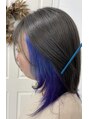 全体をアッシュ系でカラーリングしインナーのリタッチブリーチ後、根本から中間にかけてブルー、中間から毛先までパープルでオンカラー♪♪