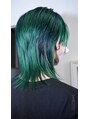 エッジの効いたハイレイヤーウルフベースにブリーチ後、根本にブルー、毛先にグリーンのルーツデザインで仕上げています。