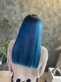 鮮やかなターコイズブルーにアクセントとして前髪にパープル