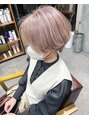 フロント長めの大人ショートスタイル。カラーはほんのりピンク味を感じるミルクティーベージュ。ブリーチ1~2回位。