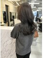 韓国女優のような透明感のあるくすみブルー、ダークアッシュ、グレージュカラーし、全体のカットは重めで切りながら顔まわりにレイヤーを入れて軽やかスタイル。毛先と顔まわりをデジタルパーマで簡単スタイリングに。インスタ 『@hideki.chiba』巻き方動画も