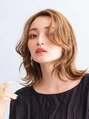 顔周りレイヤーとフェイスラインの大きなSカールがポイントのミディアムスタイルです。頬にかかる毛束と首元がくびれるシルエットで小顔効果も抜群。前髪はフワッとかきあげて、抜け感と透明感のある仕上がりに。