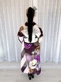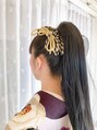 高めのポニーテールに付け毛をつけてさらに長さだし、リボンや水引きの飾りをバランス良くつけました★着物もブーツでカッコよく、個性的で素敵でした☆