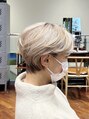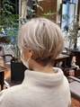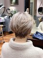 後ろに丸みを残した頭の形を綺麗に見せてくれるショートです。元々の白髪を活かした白髪ぼかしカラーで、ハイライトとローライトを混ぜてその人に出来ないオリジナルのデザインを作りました。