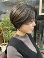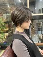 大人かわいい前下りのハンサムショート、大人ショートボブはシャープに切った毛先のライン、襟足をしめスッキリ見せたり、メリハリを効かせ絶妙なバランス!ブリーチなしのオリーブグリーンで、赤みを消して透け感を! ウェットスタイル楽しみません?
