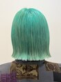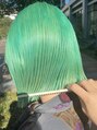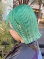 柔らかく明るく見えるクリアなミントグリーン。自然光や光の加減によって透け感や見え方が変わってかわいいです♪飛ばしたハイトーンカラーと切りっぱなしボブの相性が◎