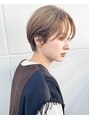 前髪長めのマッシュショート。後頭部の丸みと首にフィットして頭が小さく見えるようにカットしています。顔まわりは毛流れができるように緩くパーマをかけると乾かしただけでこの感じが出せます。カラーは明るめのアッシュベージュでこれからの季節にも◎