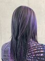 トップはアシンメトリーにブロッキングして、分け目を変えるとブラックとパープルに分けられるようにしてあります