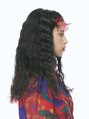 前髪だけを赤に染めたバングカラーをシースルーバングにアレンジし、洗練されたトレンドスタイルに。全体に細かなウェーブパーマをかけることによって、クールさとストリート感を生み出しています。