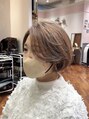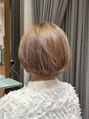 丸みのあるショートボブでライン感を残してボブっぽくカットしました。前髪は長めで動きをつけて重みのあるボブではなく軽さのあるボブです。明るめのハイライトを入れて透明感を出して柔らかく見えるスタイルです。