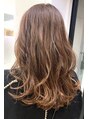 ナチュラルなモーブ系ブラウンに、ほんのり暖色を加えたお色味が肌色のトーンアップにもつながります。全体的にリバースに巻いた毛先で大人っぽく仕上げました。