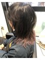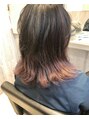 デザインカットとカラー。毛先と顔回りにブリーチと紫カラー。トップと顔回りは短くしてあえて2段に分けたヘアスタイル。