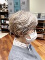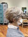 後ろに丸みを残した頭の形を綺麗に見せてくれるショートです。元々の白髪を活かした白髪ぼかしカラーで、ハイライトとローライトを混ぜてその人に出来ないオリジナルのデザインを作りました。