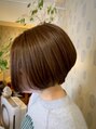 ナチュラルなショートボブ。前髪がサイドの髪の長さと同じなので、前下がりスタイルに。白髪染めですが、ファッションカラーに見えるグレージュカラーに仕上げています。