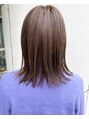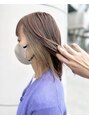 インナーカラーがかわいいミディアムコンパクト外ハネスタイル。表面のカラーは10レベルのラベンダー。インナーカラーはブリーチオンベージュ。