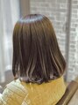 切りっぱなしのミディアムボブです、色は、ブリーチ無しの1カラーで、透明感のある、ナチュラルベージュ色になります。コテで、毛先に抜け感の、ラフな動きをつけさせる為に波巻きをし、柔らかさを表現しました。