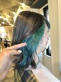 インナーカラーをエメラルドグリーンに表面はインナーカラーと合うようにアッシュ系のお色で染めました♪全頭ブリーチをしているので表面のカラーも透明感がしっかり出ます☆