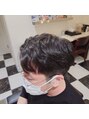 サイドからネープにかけてツーブロックと刈り上げでさっぱりとシルエットよくトップはセンターパートスタイルにパーマをかけセットしやすく流れを出しかっこよく、セットしやすく