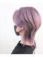 前下がりのラインのウルフカットです。メンズライクやパンクなスタイルにぴったりです。襟足長めのロングウルフ。インナーカラーは青、緑、紫の3色をランダムに配置してユニコーンカラーのような色落ちを楽しめます。ブリーチのベース作りからこだわってます