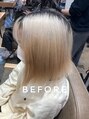 根元2cmのリタッチと毛先黒染めの残留そして毎回毛先までブリーチを繰り返していたので黒染めの履歴がない中間部分は白に近くなっている状態凄く繊細で難しい施術でしたが、、ここからムラの目立たないハイトーンに