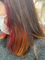 インナーカラーレッド、オレンジの2色インナーカラー耳にかけて見える所は、違う色を使うことで見え方が変わるように2色で入ってます