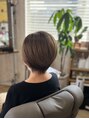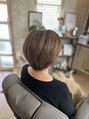 伸びてくる根元白髪を目立たなくする為柔らかく明るい色に染めております。襟足は濃いめにカラーしたツートン染め