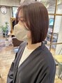 顔まわりに毛流れができる様にカット!全体はまとまりやすい顎下1センチのボブスタイル!カラーは春らしいピンクブラウン♪