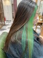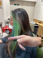 サイドのイヤリングカラーブリーチ範囲を広めてワンメイクブリーチをしペールイエローまで抜けたらプレシャンしブリーチ後かなり深みのグリーンを乗せました。内側なので一目でわかるように設定