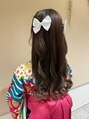 ロングヘアを活かしたぷるつやなハーフツインアレンジ。ご持参いただいたリボンの髪飾りが前から見た時にチラッと可愛いです☆髪が綺麗に見えるように、ギャルにも甘々にもならないゆったりカールがイマドキです♪