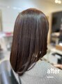 今回は酸熱トリートメントとAujuaトリートメントとカラーで艶感と透明感を出してお手入れしやすいスタイルにカットしました。カットはサイドレイヤーで顔周りに流れをつけて重くならないように工夫しています。