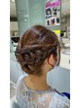 トップのくるりんぱ、サイドからの編み込みから毛先まで編んでまとめた編み込みアップスタイルです。