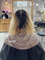 ブリーチ履歴のある髪から根元をしっかりブリーチして、ホワイトベージュのシャドールーツにしました。カットは前下がり切りっぱなしボブです。
