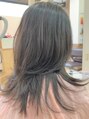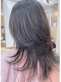表面/6トーン/グレージュ系ローライト、インナー/13トーン/ブルー系ハイライトカラー。セミロングレイヤーで動きや軽さを。ワンカールや外ハネにスタイリングしやすいラインに。