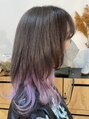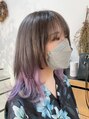 シルバーグレーのベースに淡い紫のインナーカラー、前髪にブラックのデザインを入れさせて頂きました!全体ブリーチをしてからデザインを入れるのがとてもオススメです!