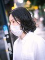 メンズミディアムロング×パーマスタイル。ワンレンベースの重ため質感に顔まわりと表面にレイヤーを。スパイラルパーマで動きを出した大人の黒髮ロングスタイル。ややウェットな状態で、N. ポリッシュオイルを使いあまり決めすぎないラフなスタイリングを。