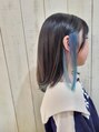 鎖骨ラインで収まりやすいようにカット。もみあげ~襟足まで低めにインナーをブリーチ後、ブルーをオンカラー。
