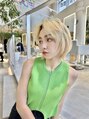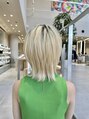 肩に付く長さをベースに顔まわりを前上がりに切り込んだウルフベースのヘアスタイル。 前髪の長さは目下あたりの長さなので、上げも下ろしもできる2wayバング。 ウルフっぽい要素が加わる事により輪郭や骨格にフィットしやすくなり、今っぽい髪型に!