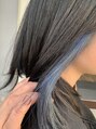 黒髪の地毛をベースにした 青色のイヤリングカラーのデザインカラーです。ブリーチの脱色具合によりますが、ブリーチ後 特有の黄色味を消す反対色の紫色を補色で出すことで綺麗にブルーに染めることができます。ご相談下さい。