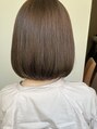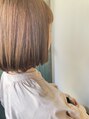 襟足ギリギリのボブスタイルです。前髪を広めにとったワイドバングが今っぽくなるポイントです。所々ポイントを押さえてマンネリしやすいボブスタイルを旬な雰囲気に。