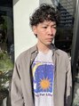 襟足の長さを少し残したソフトウルフヘア。サイドは刈り上げてボリュームを抑えて、髪全体に顎につく様に強めにパーマをかけています。前髪は長めに残す事で、立ち上げてセンターパートにしたり、下ろしてマッシュぽくしたり2way可能です。