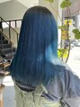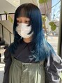顔周りにステップを作りぱつっとなるようにカットしウルフスタイルにしました。カラーは前回のブリーチを生かしてシアンカラーにしました。