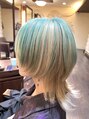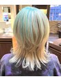 メンズウルフヘア ホワイトベージュに水色のアンブレラカラーをミックス【気に入ったスタイルはブックマークをしてご提示ください】[カラー/ブリーチ/トリートメント/ダブルカラー/ハイライト/インナーカラー/髪質改善/メンズカット/熊本/上通/並木坂/美容室]