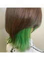 インナーのみブリーチ後、グリーンのアクセントに!2回以上のブリーチでできます!メニューにお悩みの方は“フリークーポン”ご利用ください!ハイトーン、インナーカラー、ブリーチカラー得意です!初めての方もご相談乗ります◎是非お任せください^^