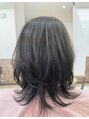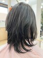 鎖骨ラインのミディアムレイヤースタイル。顔周りを包むレイヤーで内巻き・外ハネが自在に。酸性カラー(ヘアマニキュア)・ダークブラウンでツヤのある落ち着いた仕上がりに。