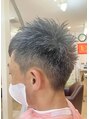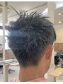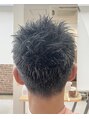 生えぐせを活かして左サイドからアシンメトリーのベリーショートレイヤー。ツーブロックを解除してサイドやバックの刈り上げを骨格に合わせてバランスを取りながらカット。ジェルやマットワックスで束感を。