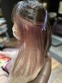 ブリーチ一回で、できる色をチョイス、パープルとベージュのミックスでオンカラーしています。トップはブリーチなしで暗めカラー。